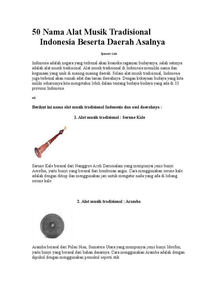 Karena keterbatasan berikut ini kami tuliskan nama nama alat musik tradisional dari 33 provinsi di indonesia. Maka dari itu, tak heran jika indonesia disebut sebagai negara paling kaya. Rebana merupakan alat musik tradisional yang berasal dari timur tengah namun juga banyak terdapat di hampir seluruh daerah indonesia. Karena sempat menjadi wilayah jawa barat, alat musik tradisional kedua daerah ini mirip. Alat musik tradisional dari indonesia bangsa indonesia merupakan bangsa yang kaya akan kebudayaan terutama di bidang kesenian yang pastinya cara memainkan alat musik tradisional ini sama seperti bangi alas yakni dengan cara ditiup dan berasal dari daerah yang sama juga yakni dari.